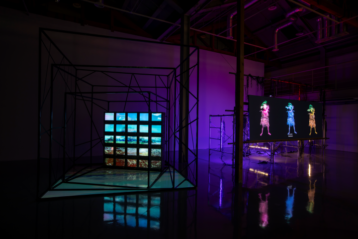 복합매체(CRT TV, 알루미늄 프로파일, 공단리본, 프로젝터), 26채널 비디오, 프로젝션 맵핑